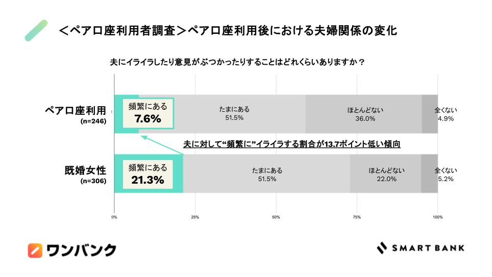 すると、夫に“頻繁に”イライラする割合は、“ペア口座”を利用している妻が13.7ポイント低い傾向にあることがわかりました。