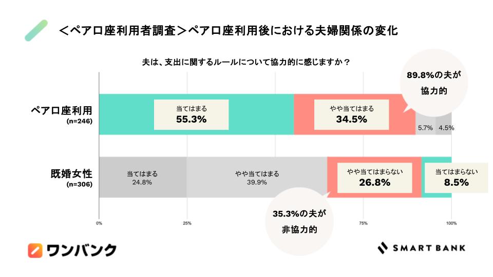 また、夫が支出に関するルールについて協力的に感じるかどうかを比較すると、ペア口座利用では、合わせて89.8%が「夫が家庭における支出に関するルール順守に協力的」だと感じていることが分かりました。