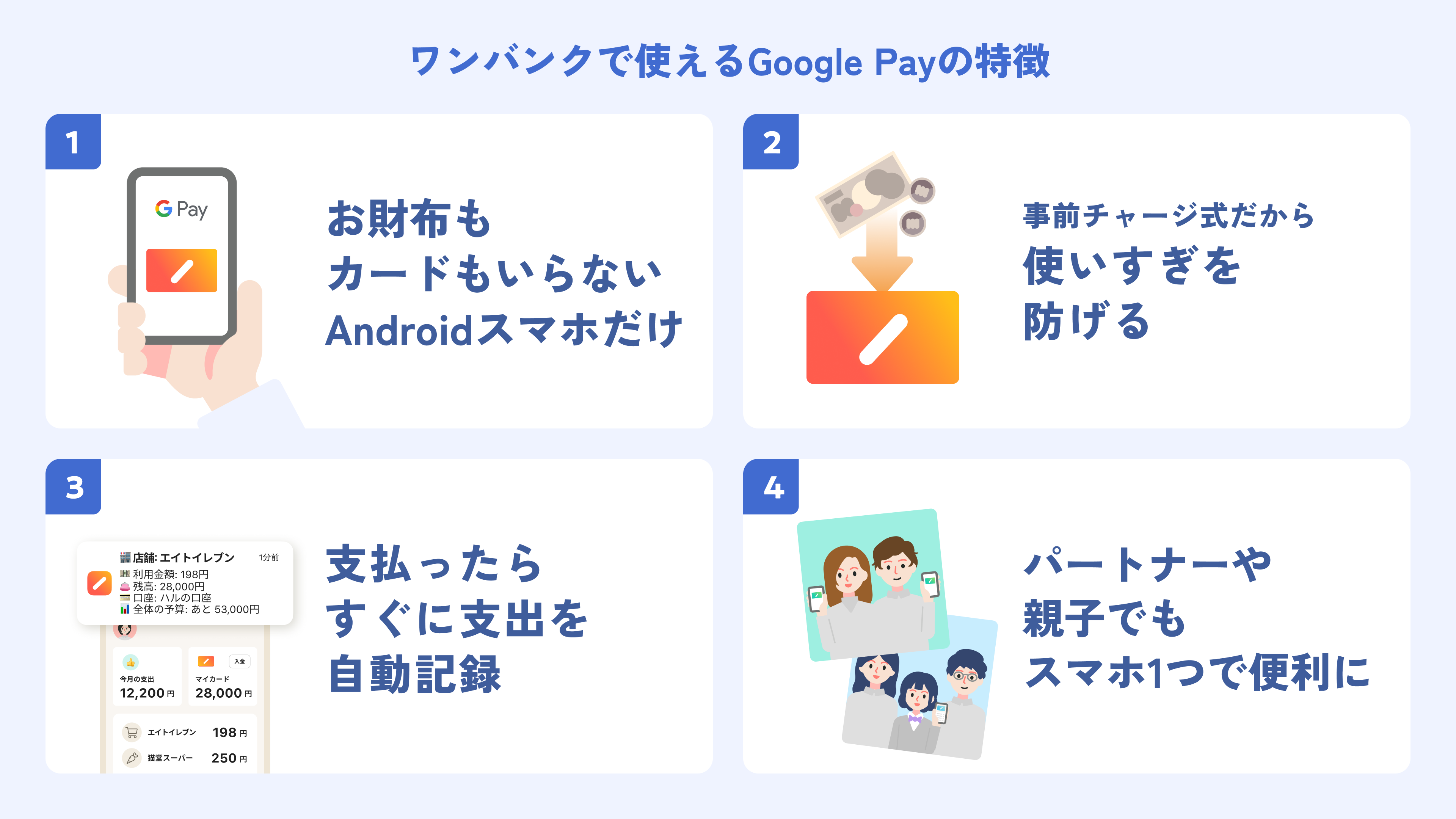 2025.11.27#PRESS RELEASEAI家計簿「ワンバンク」、 Google Pay対応でVisaのタッチ決済が可能に株式会社スマートバンクが運営するAI家計簿アプリ「ワンバンク」はGoogle Pay™への対応を開始しました。これにより、ユーザーはワンバンクのVisaプリペイドカードを持ち歩かずに、Android™スマートフォンひとつで日本および海外のVisaのタッチ決済対応加盟店や交通機関での支払いが可能となります。開発背景キャッシュレス決済が生活の一部となる中、非接触型のタッチ決済やスマホ決済の利用が急速に広がっています。ビザ・ワールドワイド・ジャパンによると、日本でのVisaのタッチ決済の利用率は2025年9月末時点で二件に一件を超えています。また、メットライフ生命の調査では、4人に1人が「財布を持ち歩かない」生活をしていることが分かっています※。私たちは、「お金に悩まない未来を、新しい常識で」というミッションのもと、「ワンバンク」を通じてより多様な支払い手段を提供し、ユーザーの利便性向上に取り組んできました。今回、その取り組みの一環として、日常のキャッシュレス体験をさらに手軽で便利にするため、ワンバンクのAndroid版アプリが新たにGoogle Payに対応しました。※:メットライフ生命「全国47都道府県大調査2024」よりワンバンクで使えるGoogle Payの特徴1. カードを持ち歩かず、Androidスマホだけで決済可能財布を持たずにAndroidスマートフォンだけで外出でき、国内外のVisaのタッチ決済対応加盟店・一部交通機関で決済ができます。タッチ決済なら暗証番号入力が不要で、カードの紛失リスクも低減します。2. 事前チャージ式だからお金の使いすぎを予防ワンバンクカードは事前に必要な分だけチャージして支払う仕組みなので、クレジットカードや自動チャージのキャッシュレス決済のように「いつの間にか使いすぎていた!」ということを防げます。3. 支払ったらすぐに支出を自動記録決済した瞬間に、利用金額・店舗名・今月の支出額をリアルタイムでアプリに反映。家計管理がこれまで以上に簡単に。4. パートナーや親子での共同管理もスマホ1つで便利に自分ひとりで使う以外にも、パートナーや家族での共同管理も可能です。・ワンバンクペアカード:ふたりの共同口座からスマホで決済。チャージ額内で使えて安心。・ワンバンクジュニアカード:お子さまがカードを持ち歩く必要なし。紛失リスクゼロで安全。使い方ワンバンクの[カード]タブで「Google Payをはじめる」ボタンをタップ。ウォレットアプリの案内に従い設定する日頃のお会計時にAndroidスマートフォンをVisaタッチ決済マークにかざす支払い完了と同時に、支出情報がワンバンクアプリに自動反映されるなお、これまでECサイトなどのオンライン決済でのみ利用可能だったワンバンクのバーチャルカードも、Google Pay対応によりコンビニ・スーパー・飲食店などの実店舗でも利用可能になりました。詳しい手順はユーザー向けお知らせページをご覧ください。今後の展望ワンバンクは今後も、「お金に悩まない未来を、新しい常識で」というミッションのもと、多様な支払いシーンに対応する利便性と安全性を追求してまいります。今後はAndroidスマートフォン以外でのタッチ決済機能にも対応を予定しています。※ Google Pay および Android は、Google LLC の登録商標または商標です。Recommend関連する最新情報2025.11.27#PRESS RELEASEAI家計簿「ワンバンク」、 Google Pay対応でVisaのタッチ決済が可能に2025.11.19#PRESS RELEASE家計簿がポイントになる! ワンバンク、家計管理でトクする新機能を公開2025.11.11#PRESS RELEASE#NEWS株式会社スマートバンク、YAPC::Fukuoka 2025に Platinumスポンサーとして協賛2025.11.05#PRESS RELEASEAI家計簿『ワンバンク』が生活情報誌『サンキュ!』誌面企画にて受賞しました 〜パートナーとのお金の共同管理に役立つ機能が評価され「サンキュ!明るいミライ大賞 2025 for couple」を受賞〜2025.10.31#PRESS RELEASE個人事業主向け請求書買取サービス「ワンバンク請求書買取」、 開始6か月で月間買取総額が約37倍に拡大もっと見る