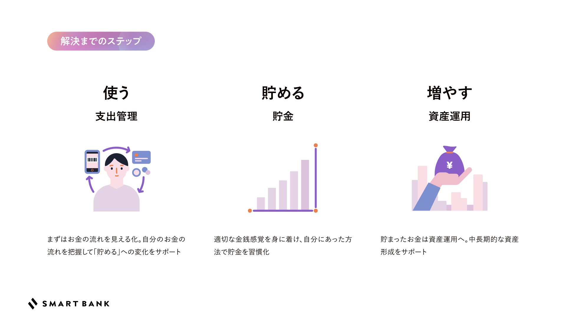 そのため、まずは支出管理の問題を解決することで貯蓄に繋げていこうとしていますが、長期的には資産形成に向けた資産運用(増やす)といった領域までサービスを提供していきたいと考えています。