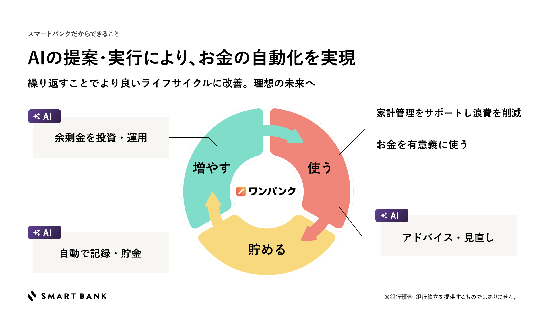 ユーザーから預かるお金と、実行をサポートすることで得られるデータの両方を保有することで、お金の自動化を実現し、引いてはユーザーの資産形成を助け、長期のライフプランを実現させていきたいと考えています。