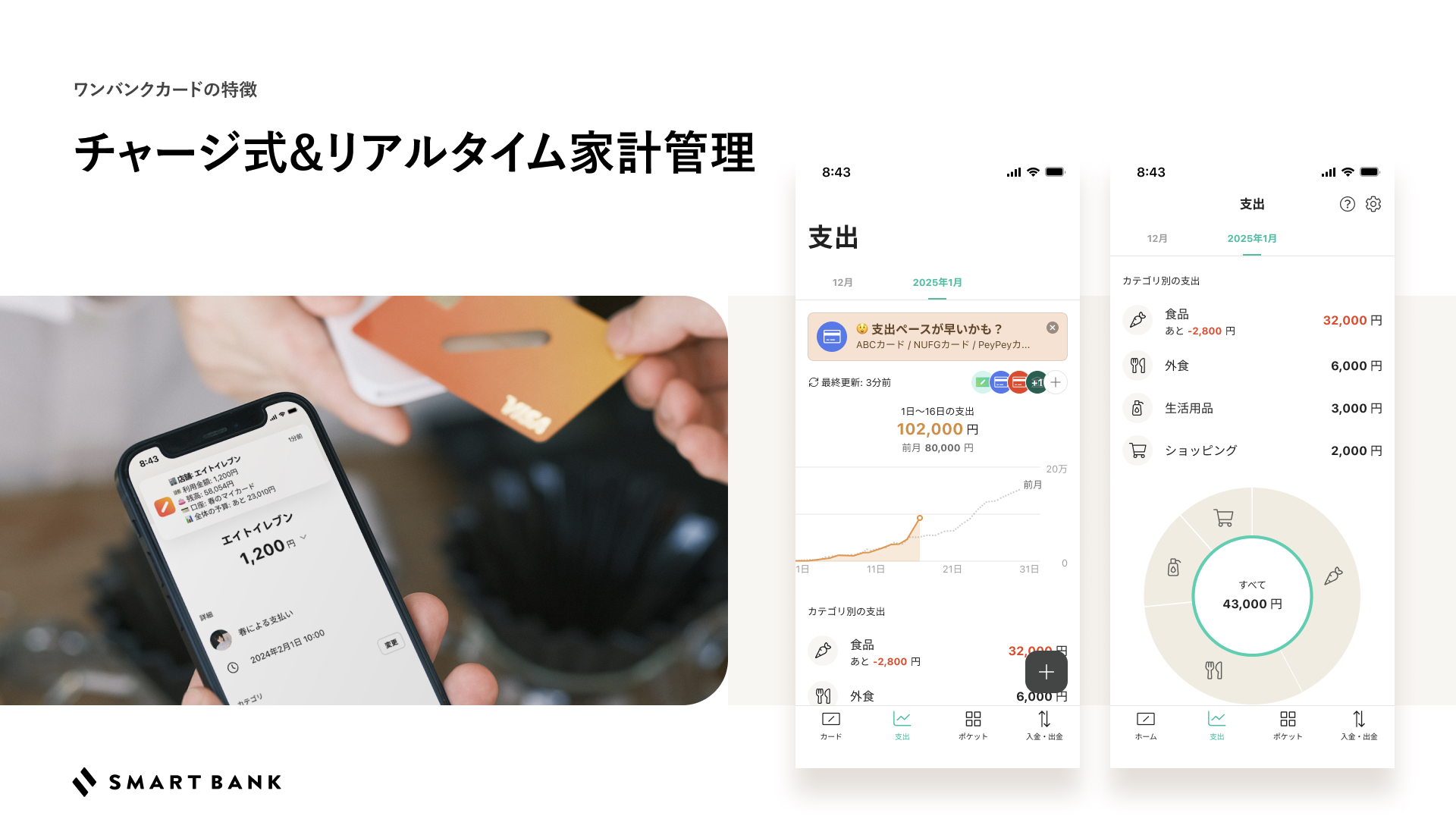 家計管理は基本的に週次や月次で締めて振り返りをする必要がありますが、一般的なクレジットカードは後払いの決済のため、月次で締めたりすることができず、家計管理には適していません。対してワンバンクは、チャージした予算内で生活費を管理することができ、リアルタイムに家計簿がつけられるというのが大きな特徴になっています。