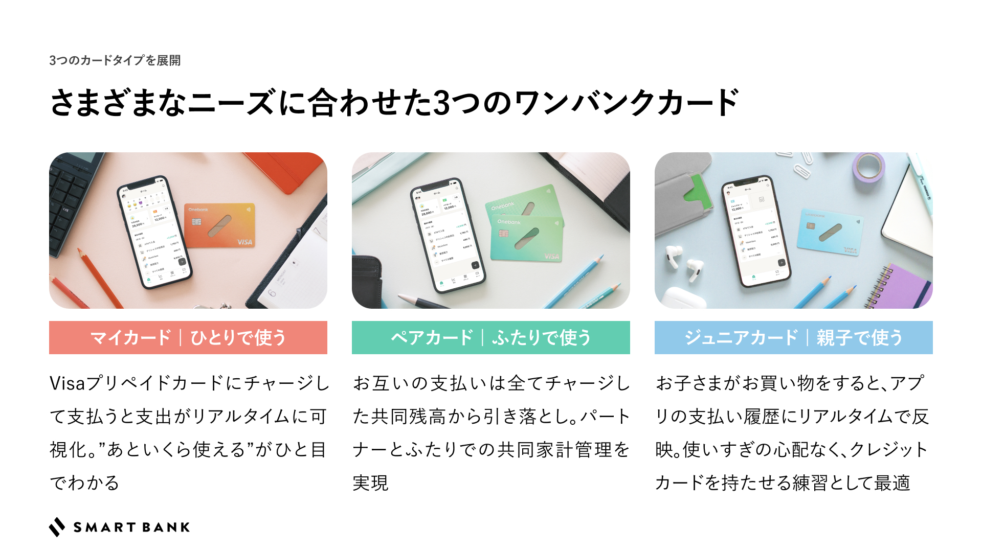 また、「個人」「カップル・夫婦」「親子」という異なるユーザーに対して、3種類のカードを提供しています。
