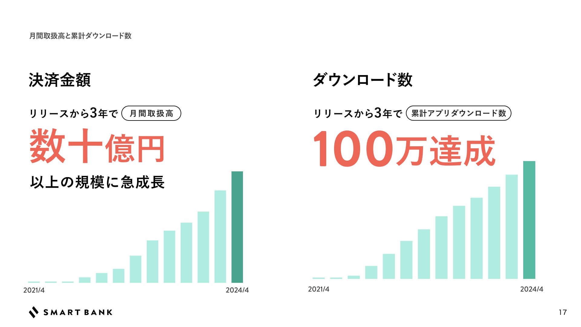 リリースから3年で、単月の決済取扱高は数十億円、累計ダウンロード数は100万DLまでに成長しており、現在も毎月高い成長率をキープできています。