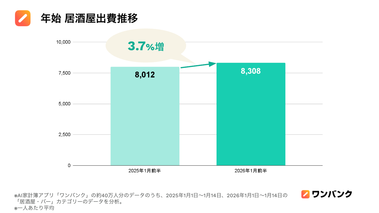 AI家計簿アプリ「ワンバンク」広報事務局より、AI家計簿アプリ「ワンバンク」ユーザーの家計簿データをもとに分析した年末年始の「居酒屋出費」に関するニュースレターをお届けします。